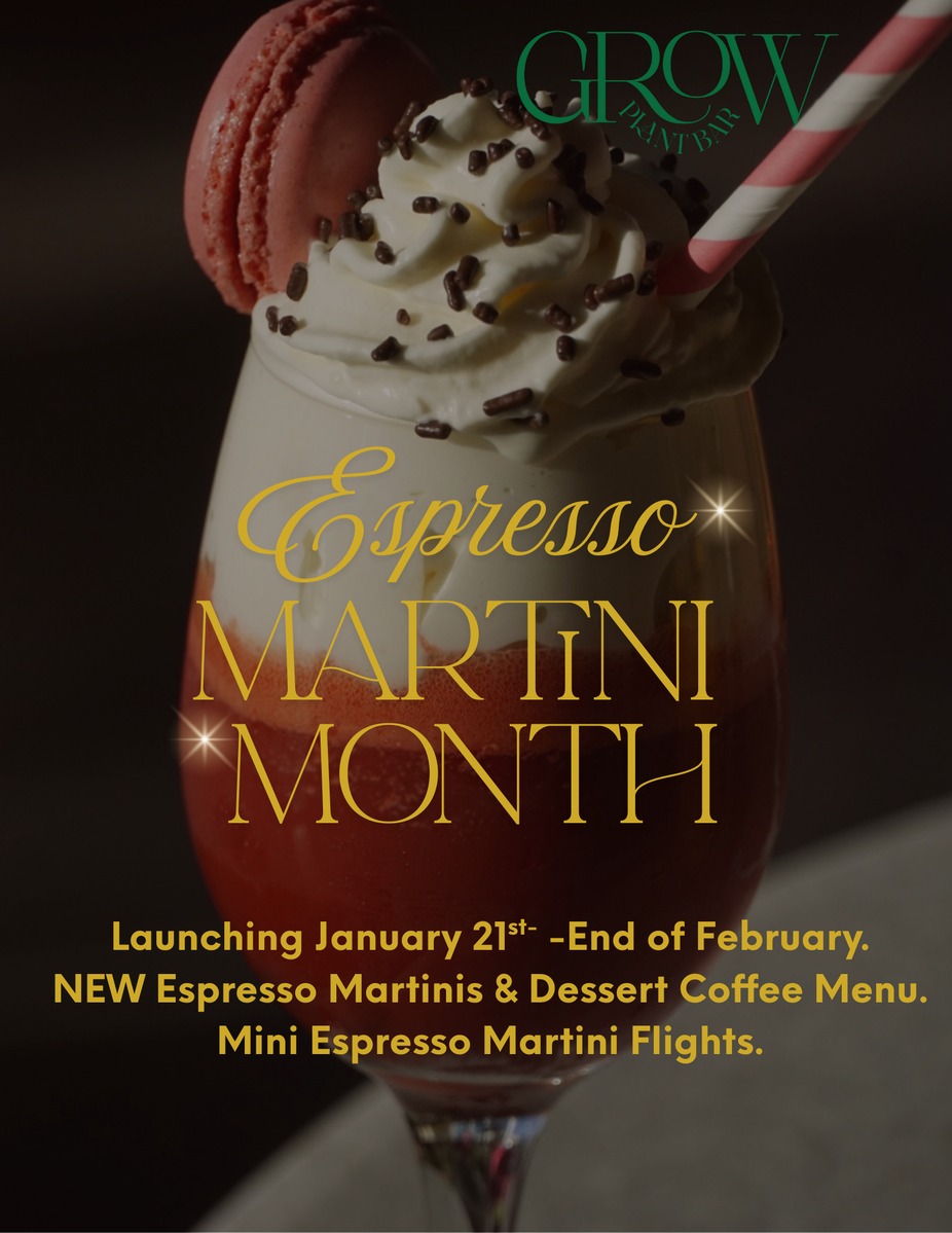 Consider us your new espresso martini bar. Espresso Martini Month runs January 21 through the end of February, featuring a full martini menu, dessert coffees, and mini flights available all month.
